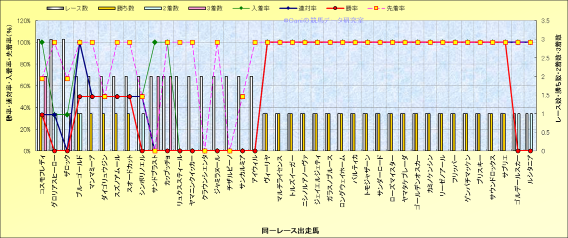 ライバル(相性)解析 同一レースに下記馬が出走した場合の成績とその馬に先着する先着率 |