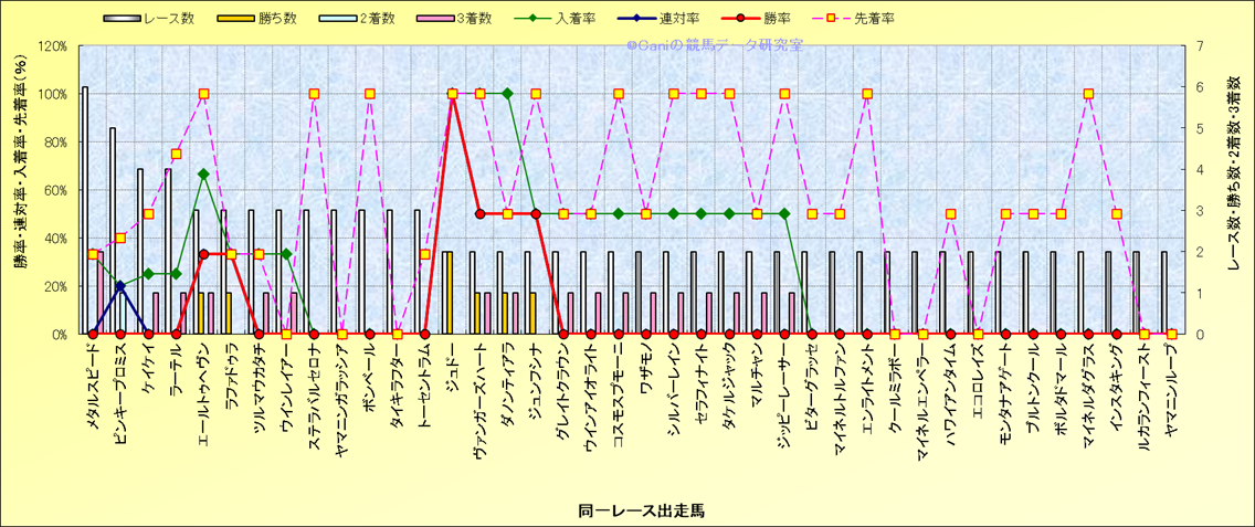 ライバル(相性)解析 同一レースに下記馬が出走した場合の成績とその馬に先着する先着率 |