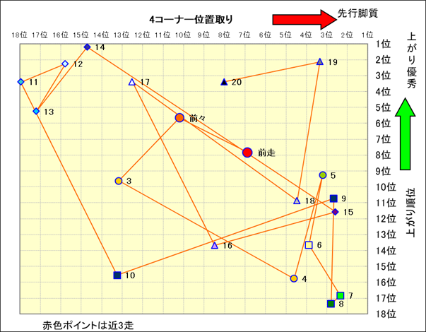 脚質解析 近20レースの4コーナーでの位置取りと上がり順位(頭数補正後) |