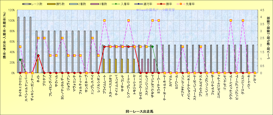 ライバル(相性)解析 同一レースに下記馬が出走した場合の成績とその馬に先着する先着率 |