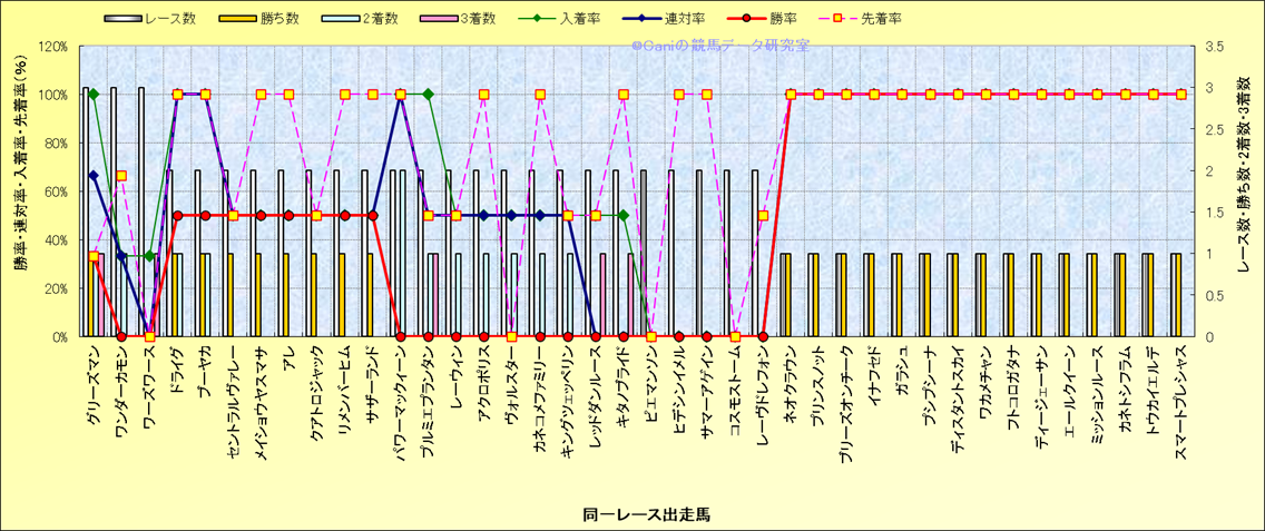 ライバル(相性)解析 同一レースに下記馬が出走した場合の成績とその馬に先着する先着率 |