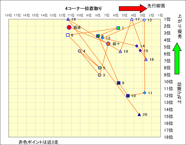 脚質解析 近20レースの4コーナーでの位置取りと上がり順位(頭数補正後) |