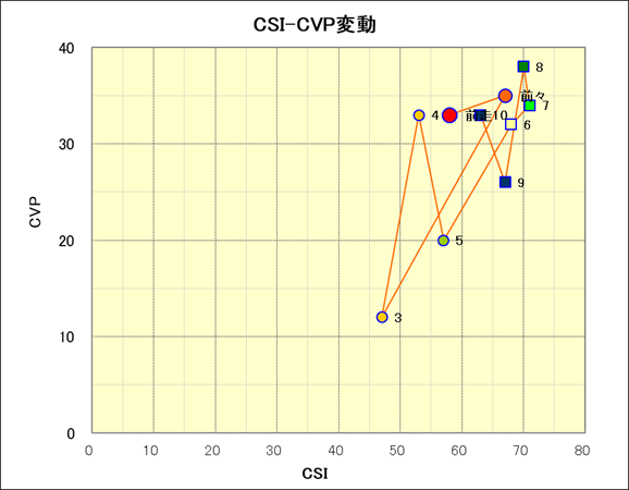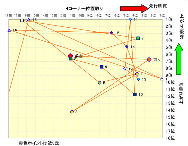 近走における4コーナーでの位置取りと上がり順位(頭数補正後) |