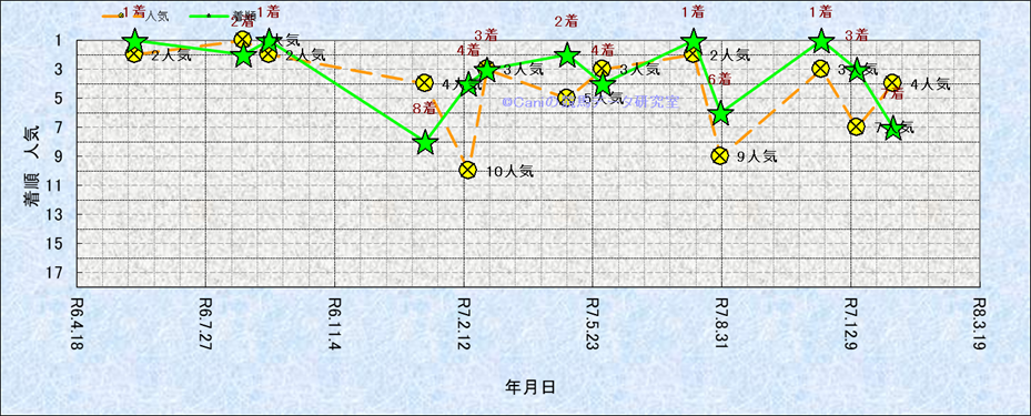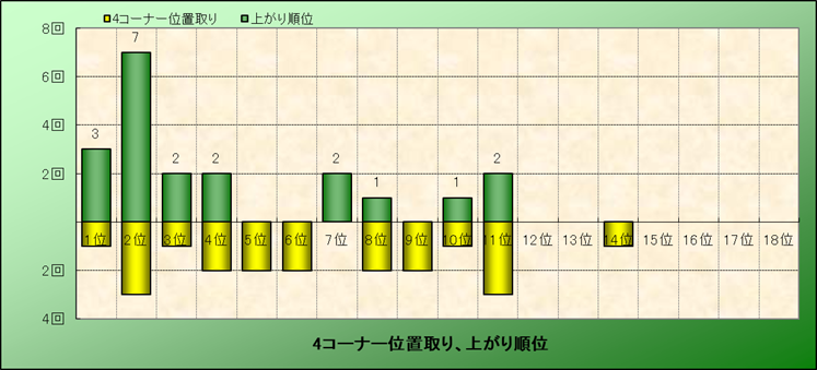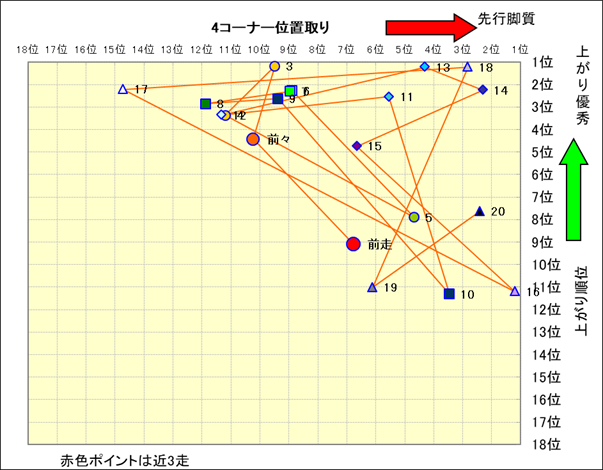 脚質解析 近20レースの4コーナーでの位置取りと上がり順位(頭数補正後) |