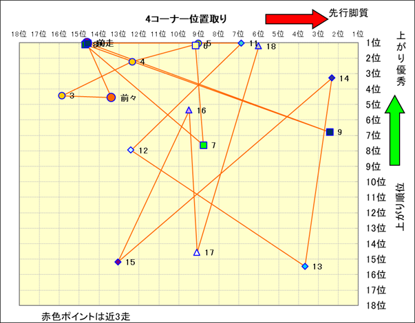 近走における4コーナーでの位置取りと上がり順位(頭数補正後) |