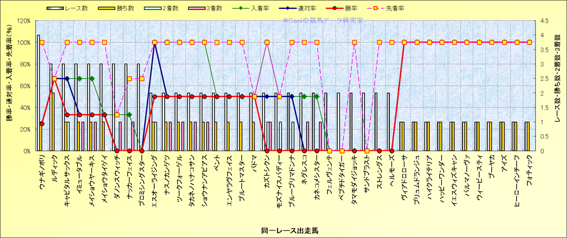 ライバル(相性)解析 同一レースに下記馬が出走した場合の成績とその馬に先着する先着率 |