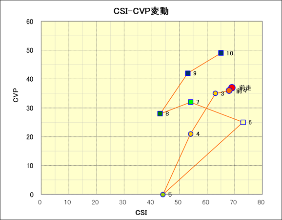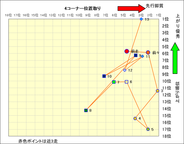 近走における4コーナーでの位置取りと上がり順位(頭数補正後) |