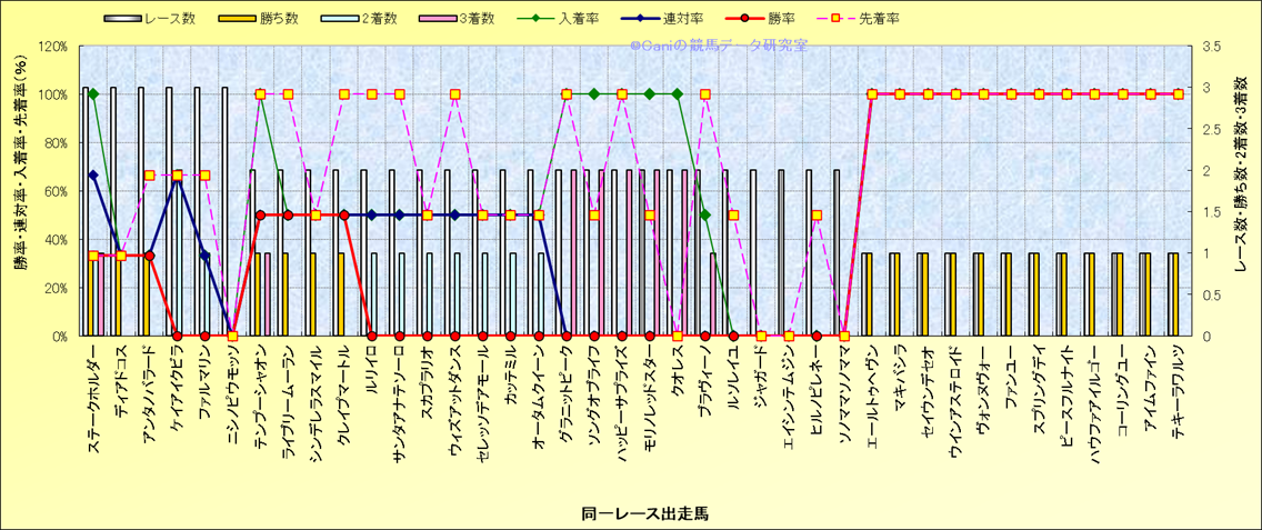 ライバル(相性)解析 同一レースに下記馬が出走した場合の成績とその馬に先着する先着率 |