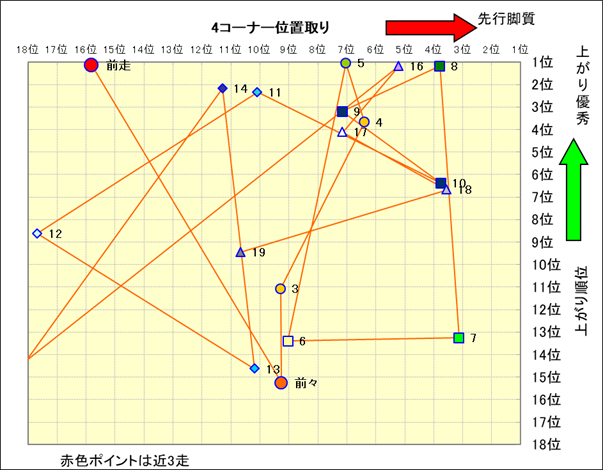 近走における4コーナーでの位置取りと上がり順位(頭数補正後) |