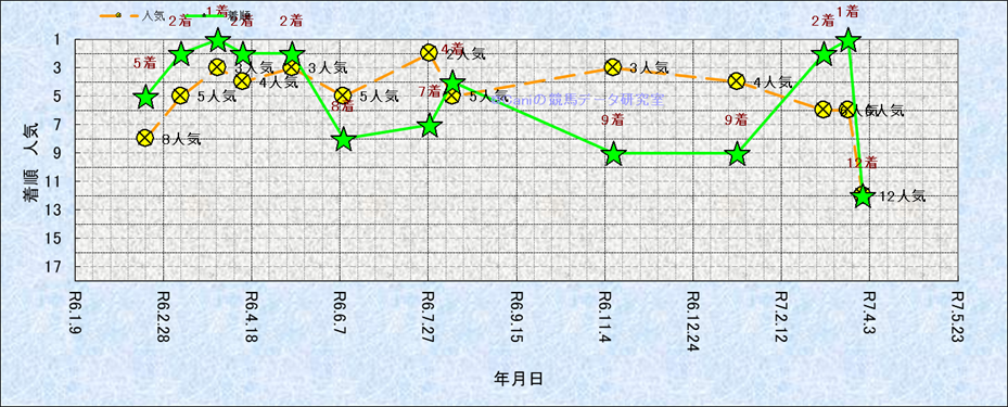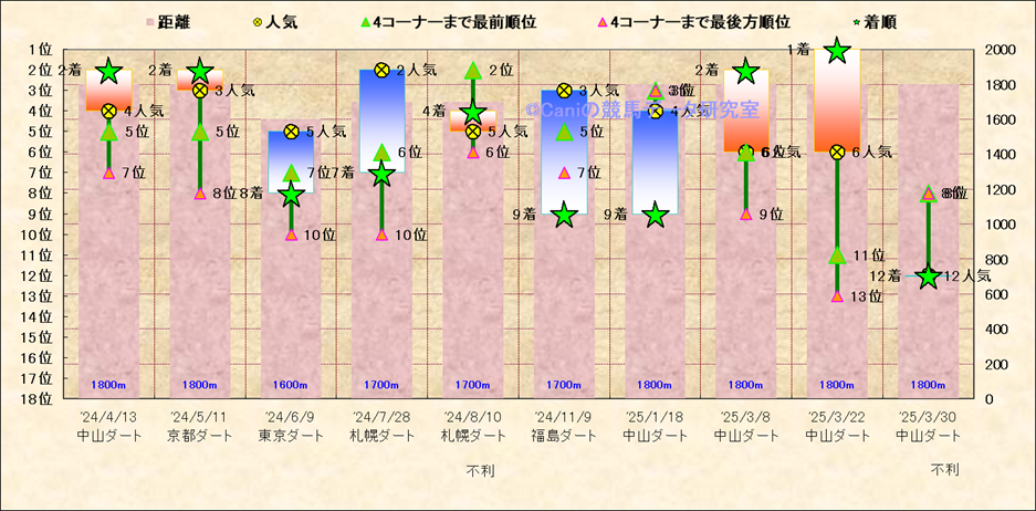 脚質解析 近20レースの4コーナーでの位置取りと上がり順位(頭数補正後) |