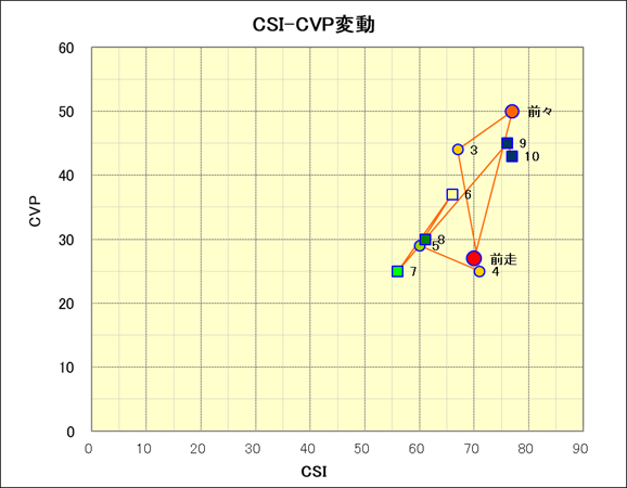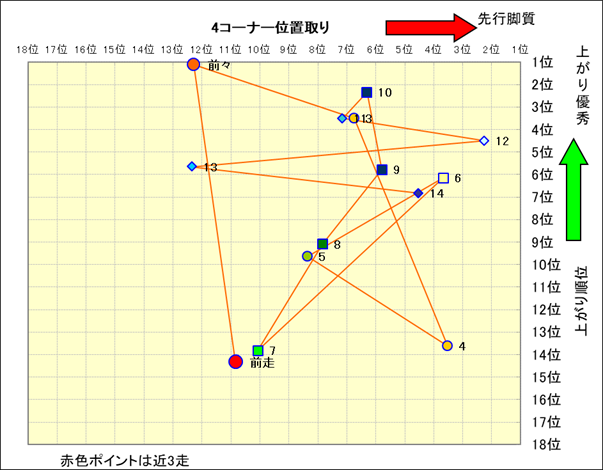 近走における4コーナーでの位置取りと上がり順位(頭数補正後) |