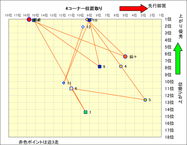 近走における4コーナーでの位置取りと上がり順位(頭数補正後) |