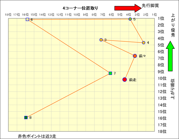 近走における4コーナーでの位置取りと上がり順位(頭数補正後) |