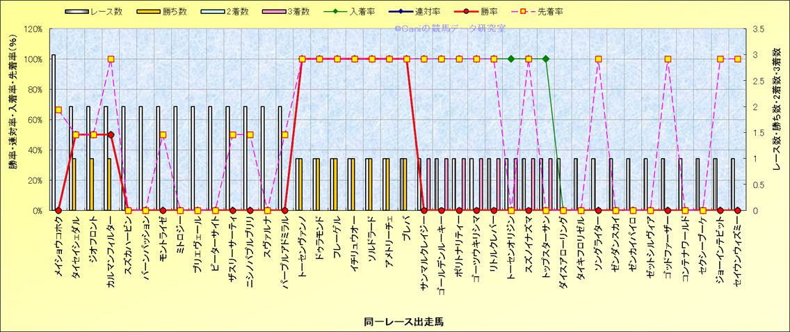 ライバル(相性)解析 同一レースに下記馬が出走した場合の成績とその馬に先着する先着率 |