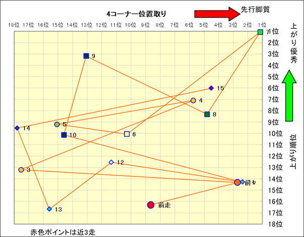 近走における4コーナーでの位置取りと上がり順位(頭数補正後) |