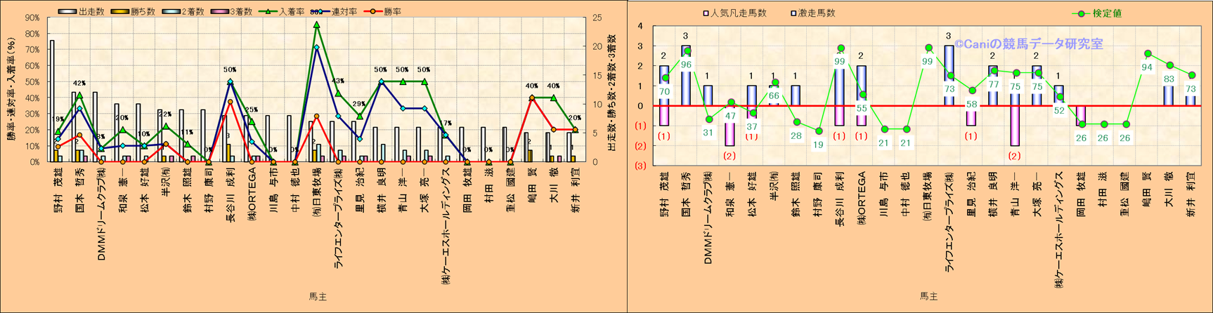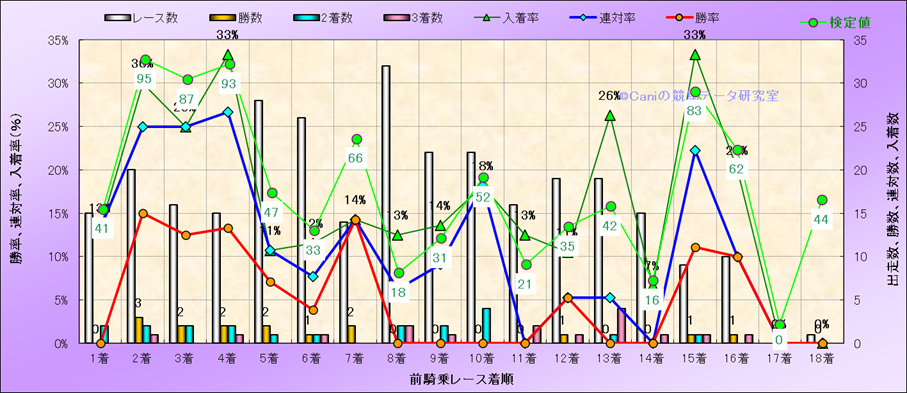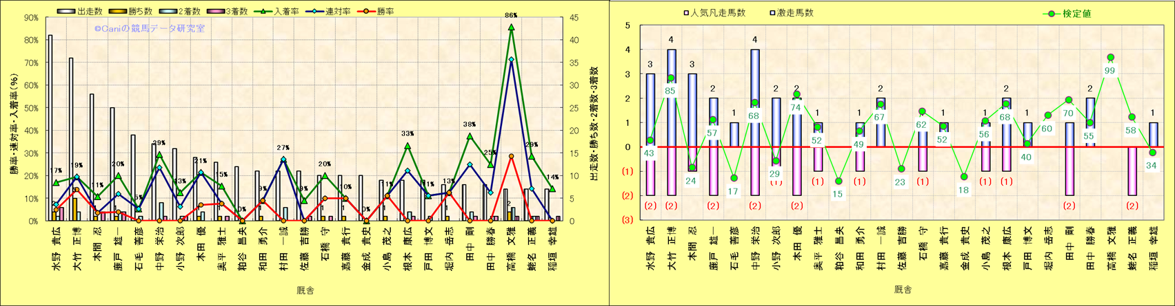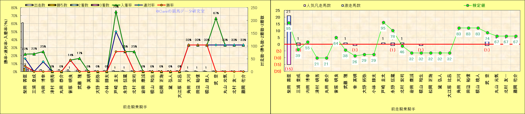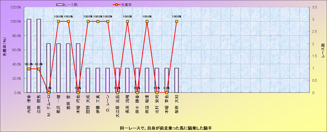 ライバル(相性)解析。 同一レースに下記騎手が騎乗した場合の成績と、その騎手に先着する先着率(近1年) |