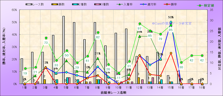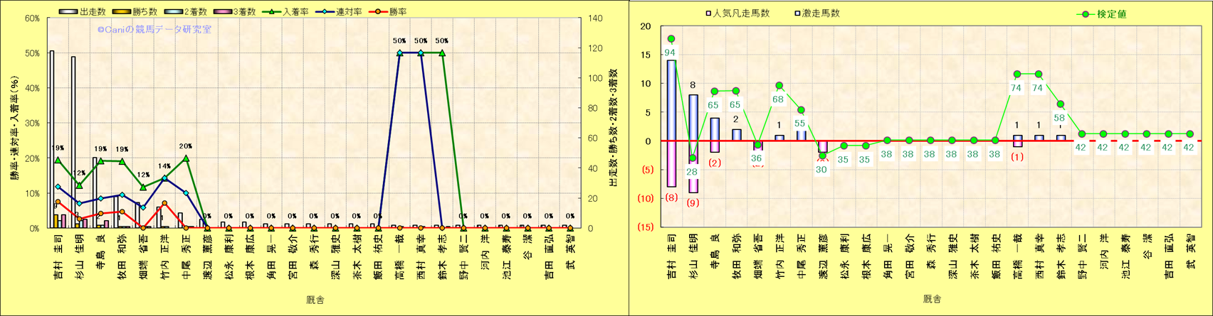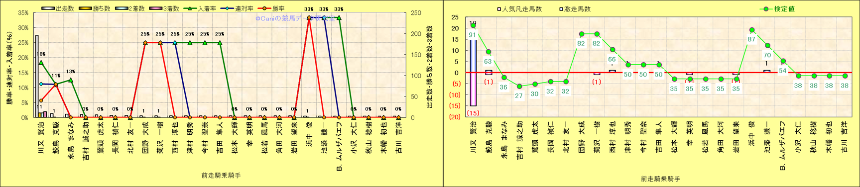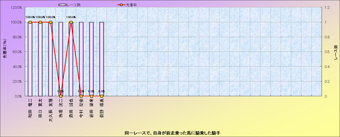 ライバル(相性)解析。 同一レースに下記騎手が騎乗した場合の成績と、その騎手に先着する先着率(近1年) |
