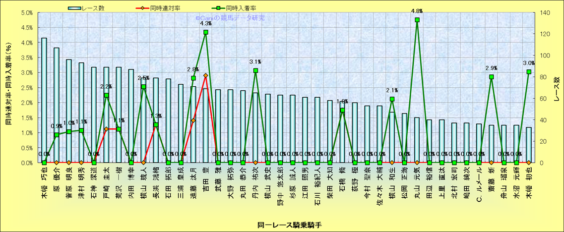 ライバル(相性)解析。 同一レースに下記騎手が騎乗した場合の同時に連対する率と同時に入着する率(近1年) |