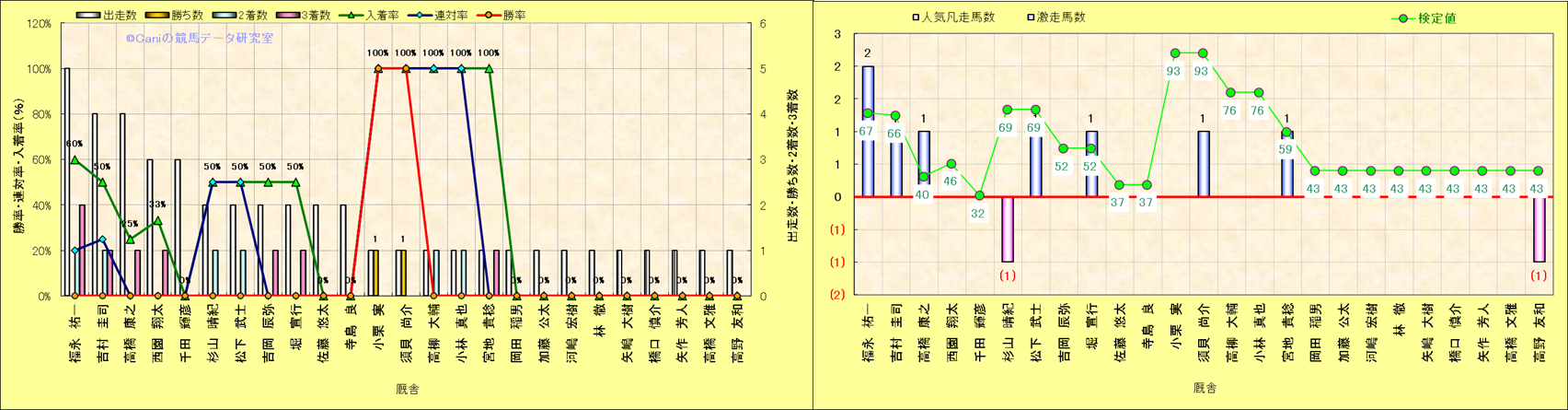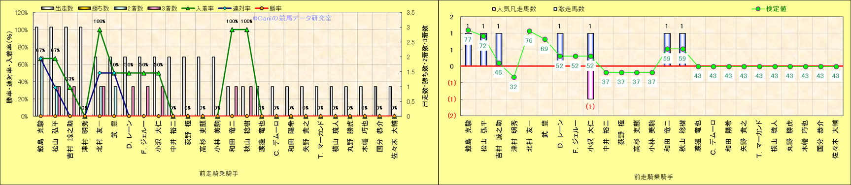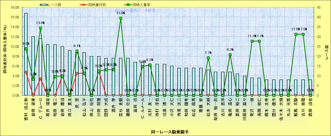 ライバル(相性)解析。 同一レースに下記騎手が騎乗した場合の同時に連対する率と同時に入着する率(近1年) |
