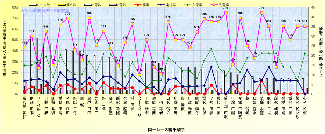 ライバル(相性)解析。 同一レースに下記騎手が騎乗した場合の成績と、その騎手に先着する先着率(近1年) |