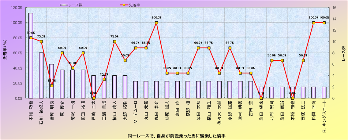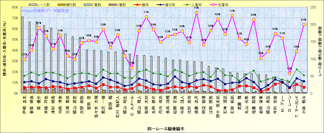 ライバル(相性)解析。 同一レースに下記騎手が騎乗した場合の成績と、その騎手に先着する先着率(近1年) |
