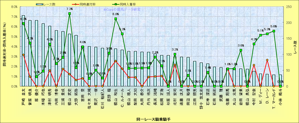 ライバル(相性)解析。 同一レースに下記騎手が騎乗した場合の同時に連対する率と同時に入着する率(近1年) |