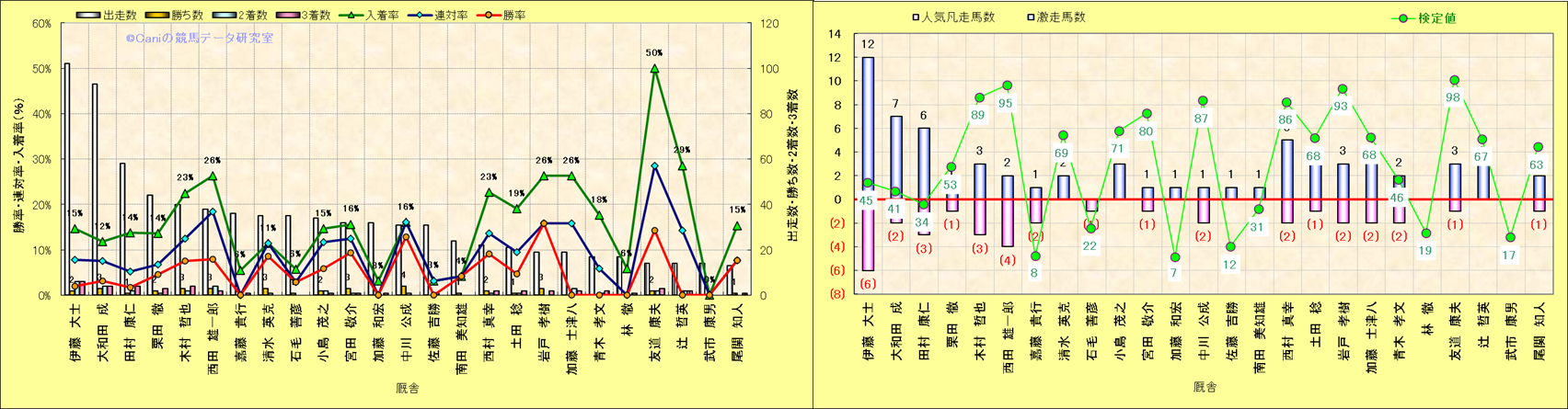 ライバル(相性)解析。 同一レースに下記騎手が騎乗した場合の同時に連対する率と同時に入着する率(近1年) |