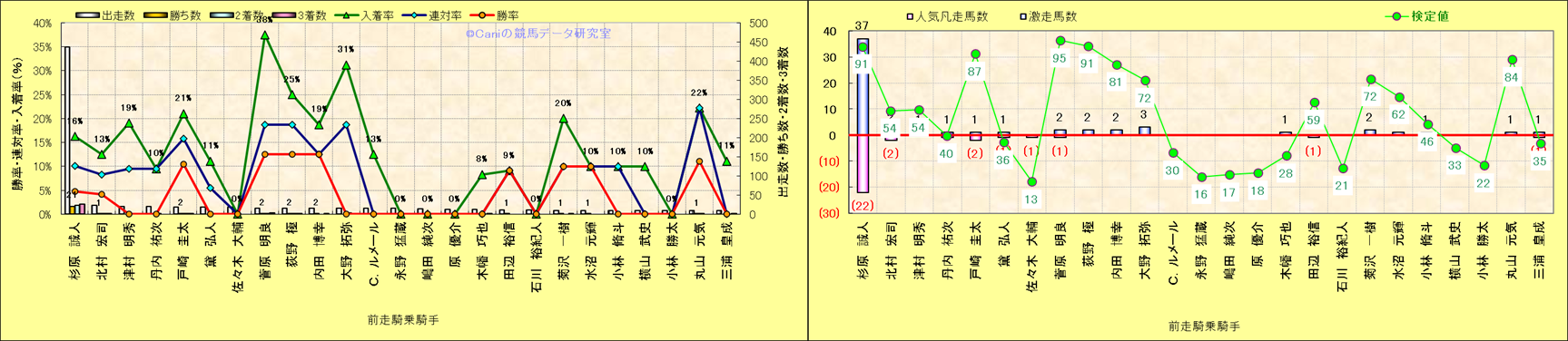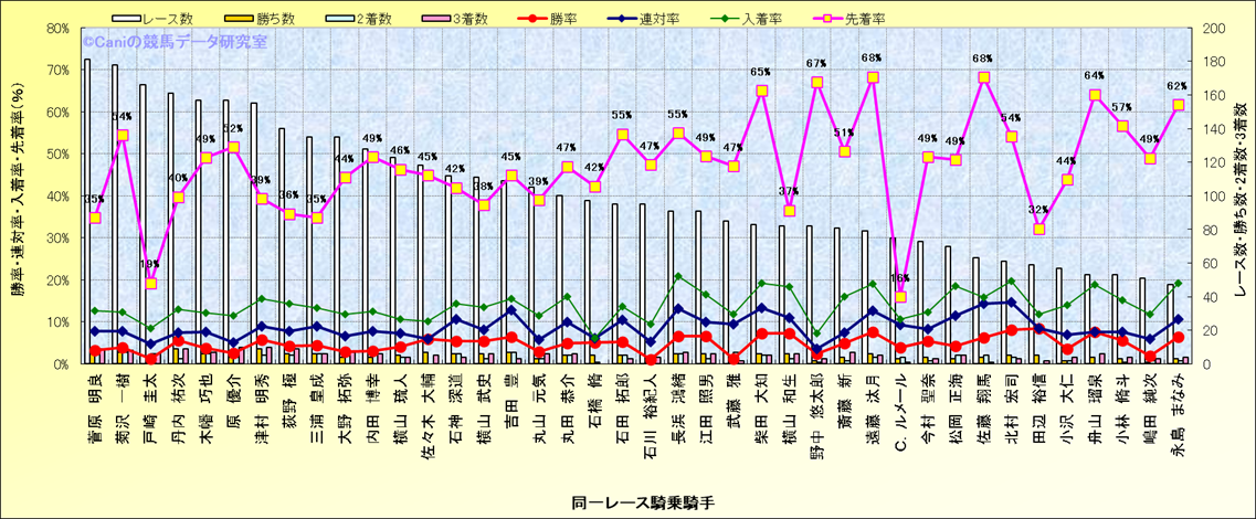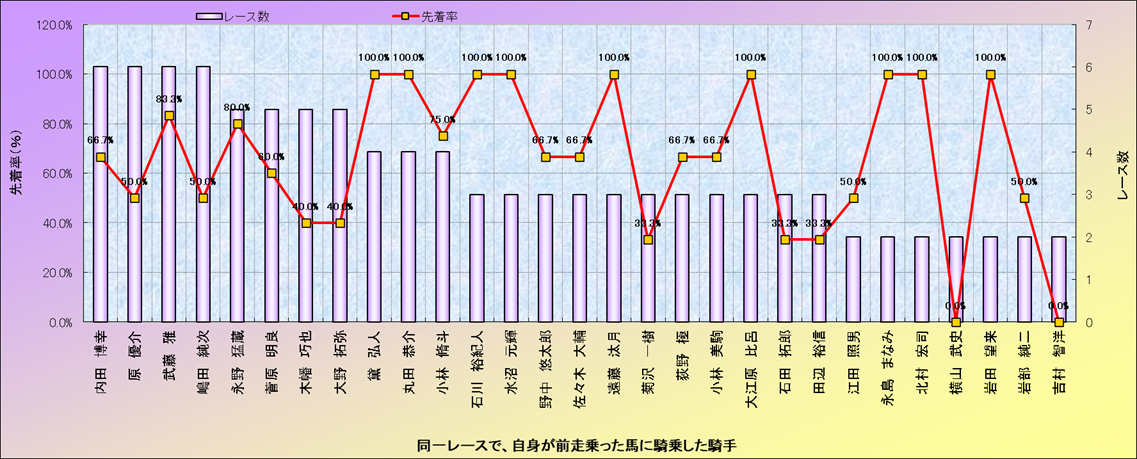 ライバル(相性)解析。 同一レースに下記騎手が騎乗した場合の成績と、その騎手に先着する先着率(近1年) |