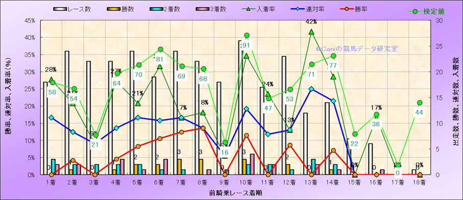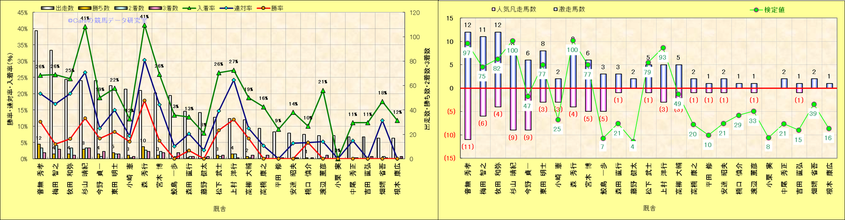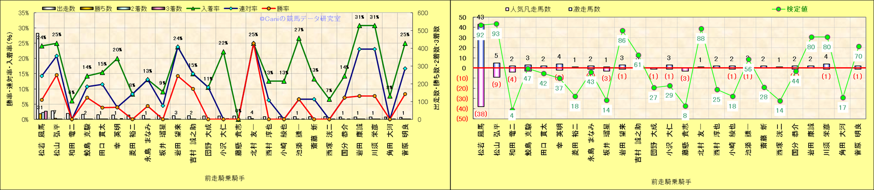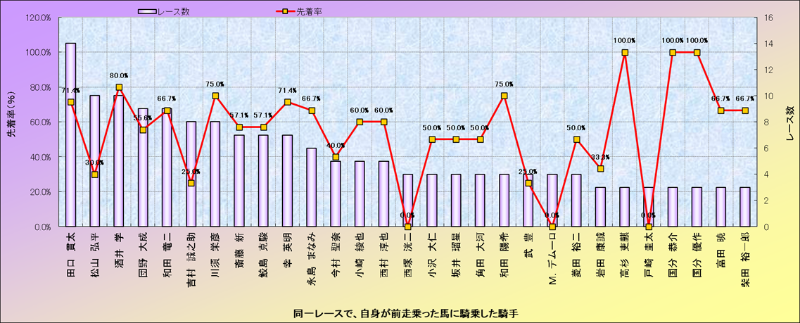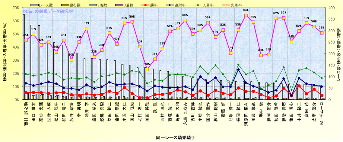 ライバル(相性)解析。 同一レースに下記騎手が騎乗した場合の成績と、その騎手に先着する先着率(近1年) |