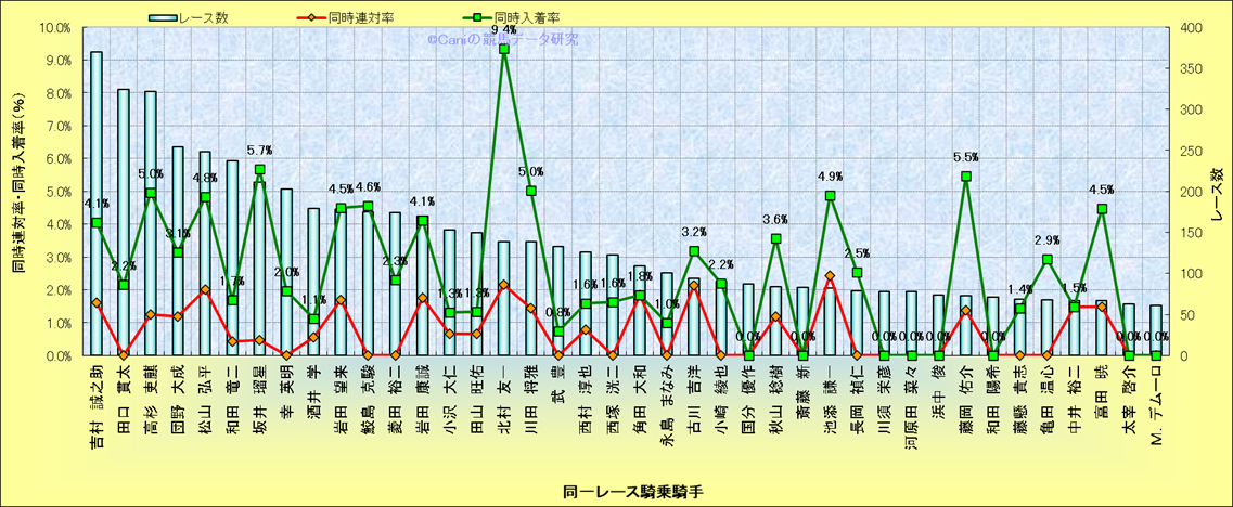 ライバル(相性)解析。 同一レースに下記騎手が騎乗した場合の同時に連対する率と同時に入着する率(近1年) |