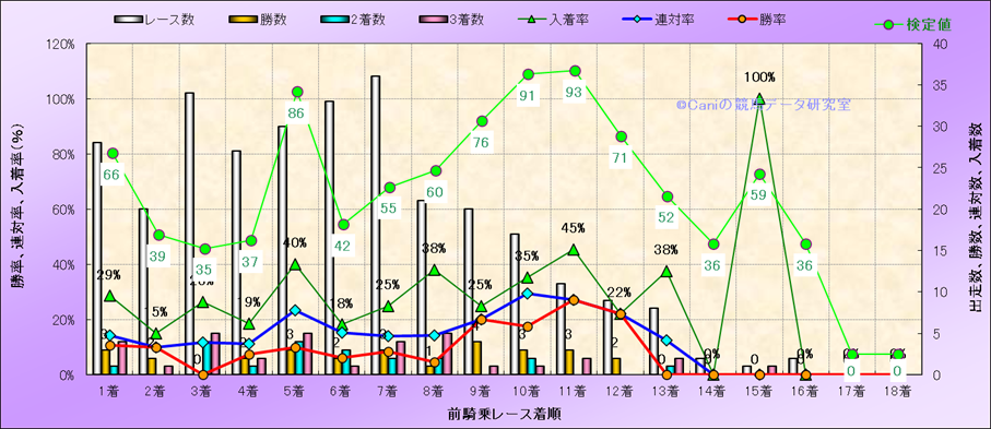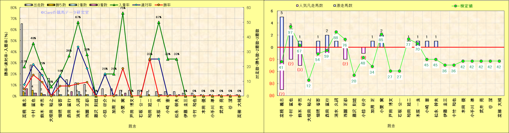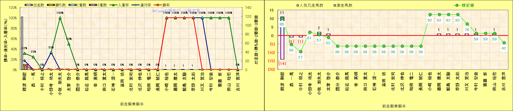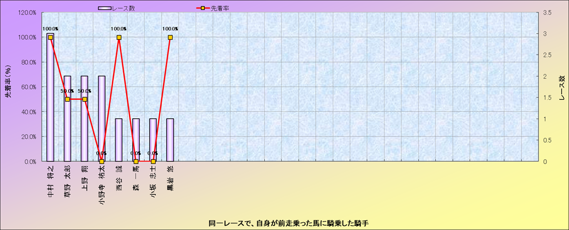 ライバル(相性)解析。 同一レースに下記騎手が騎乗した場合の成績と、その騎手に先着する先着率(近1年) |