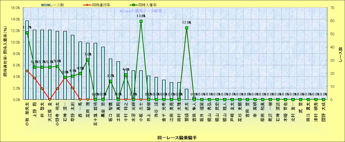 ライバル(相性)解析。 同一レースに下記騎手が騎乗した場合の同時に連対する率と同時に入着する率(近1年) |
