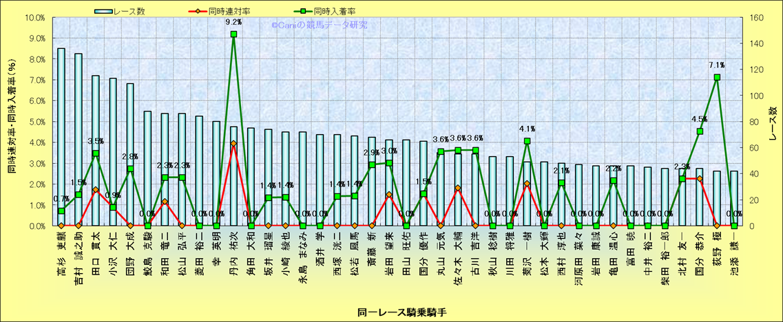 ライバル(相性)解析。 同一レースに下記騎手が騎乗した場合の同時に連対する率と同時に入着する率(近1年) |