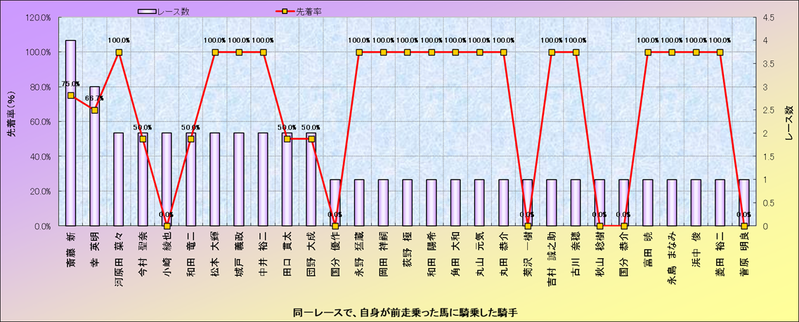 ライバル(相性)解析。 同一レースに下記騎手が騎乗した場合の成績と、その騎手に先着する先着率(近1年) |