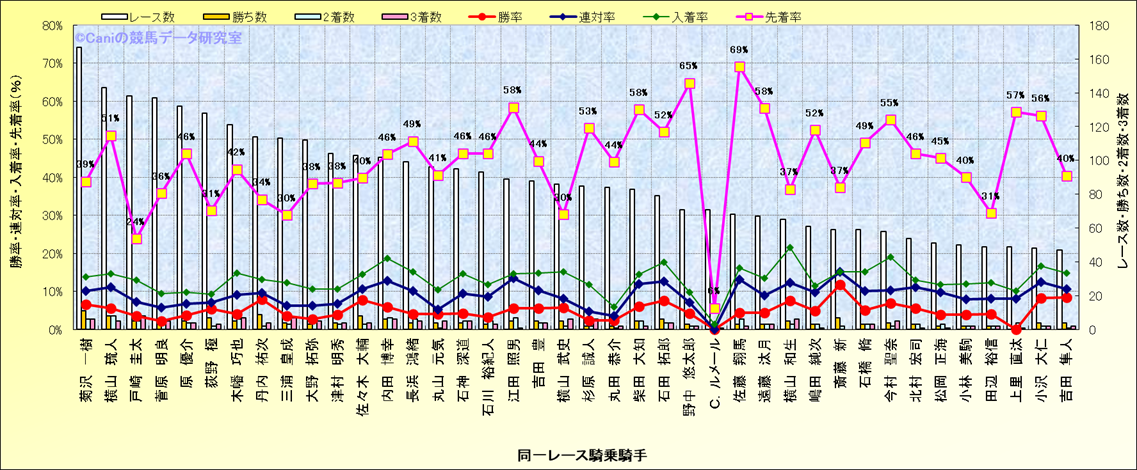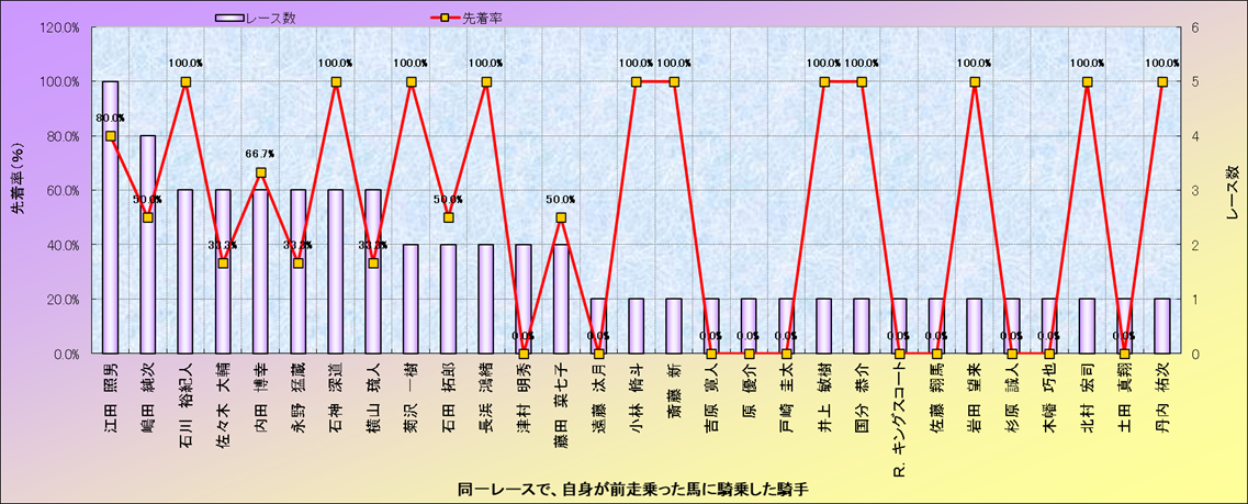 ライバル(相性)解析。 同一レースに下記騎手が騎乗した場合の成績と、その騎手に先着する先着率(近1年) |