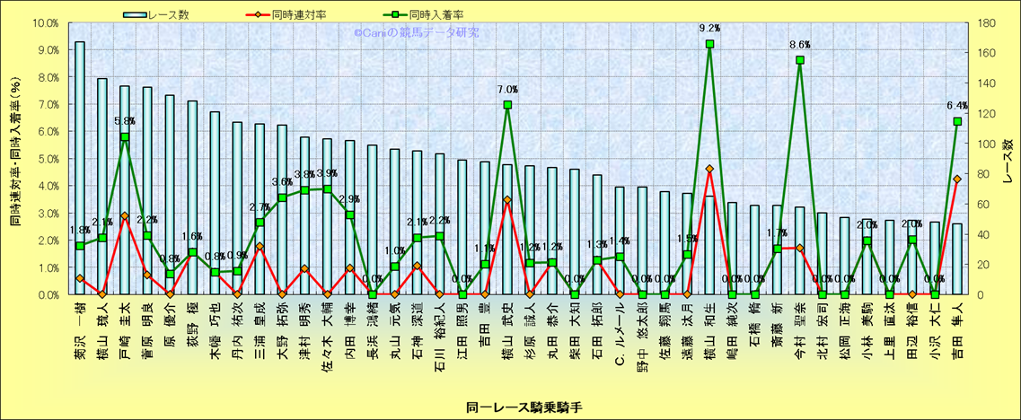 ライバル(相性)解析。 同一レースに下記騎手が騎乗した場合の同時に連対する率と同時に入着する率(近1年) |