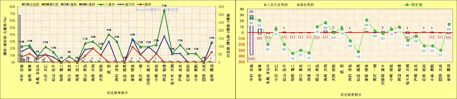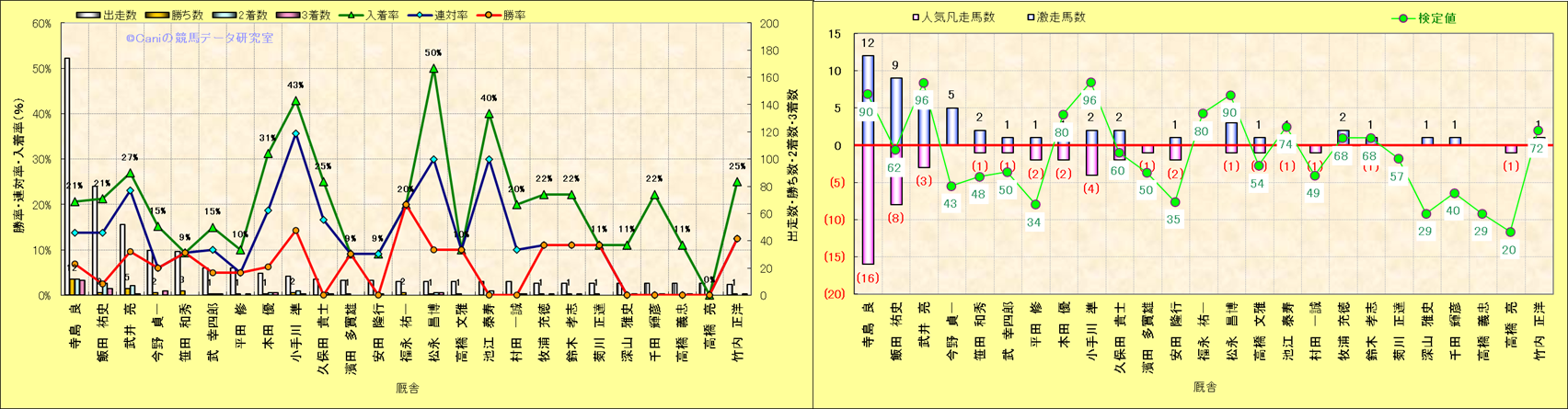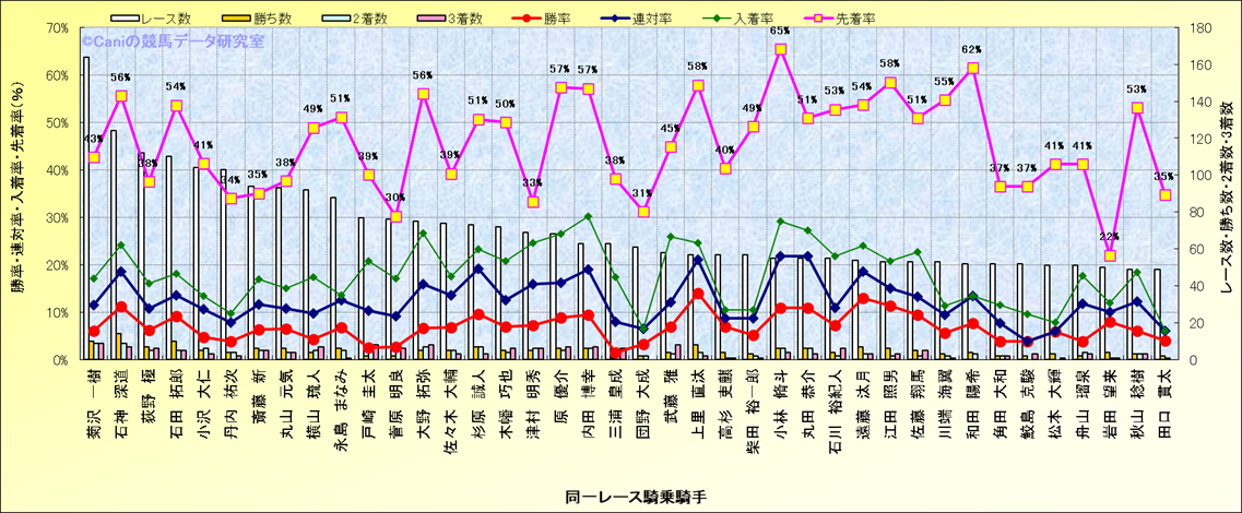 ライバル(相性)解析。 同一レースに下記騎手が騎乗した場合の成績と、その騎手に先着する先着率(近1年) |
