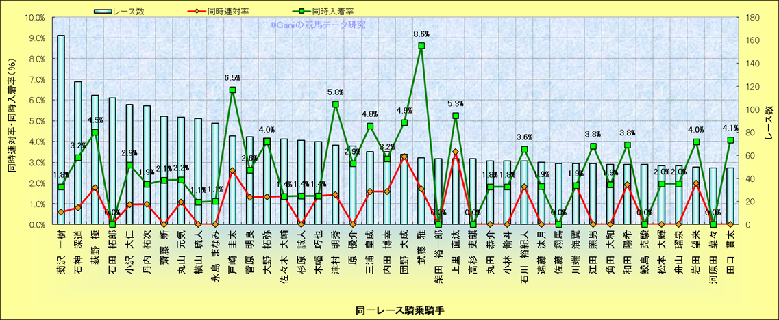 ライバル(相性)解析。 同一レースに下記騎手が騎乗した場合の同時に連対する率と同時に入着する率(近1年) |