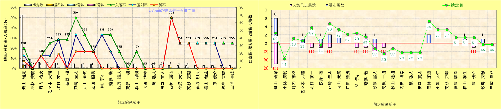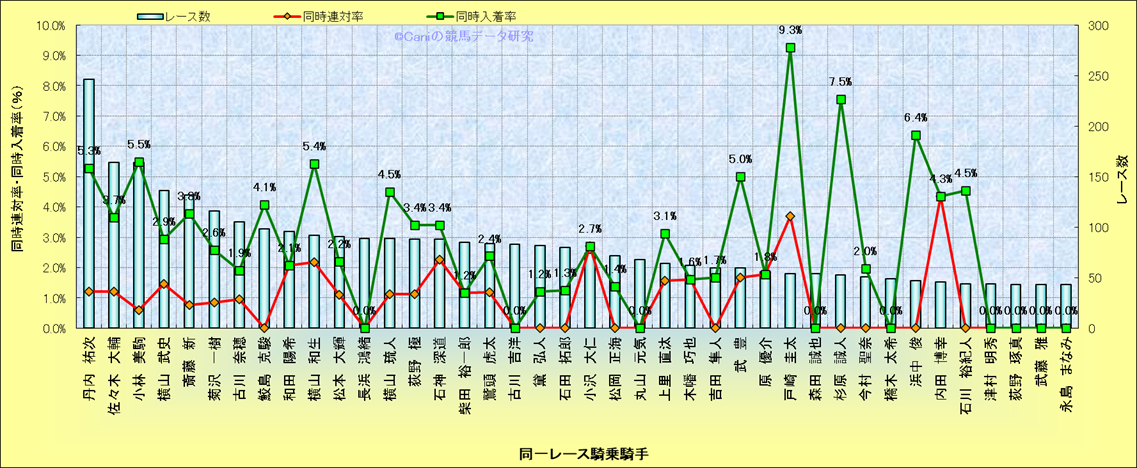 ライバル(相性)解析。 同一レースに下記騎手が騎乗した場合の同時に連対する率と同時に入着する率(近1年) |