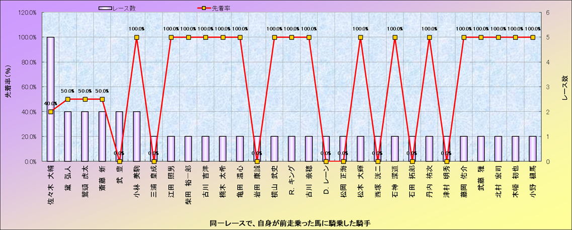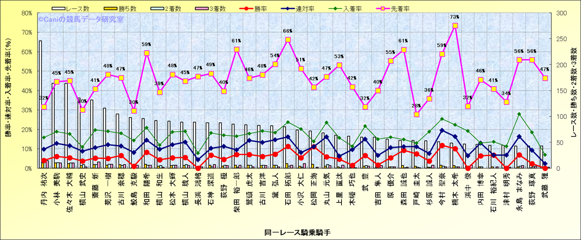 ライバル(相性)解析。 同一レースに下記騎手が騎乗した場合の成績と、その騎手に先着する先着率(近1年) |