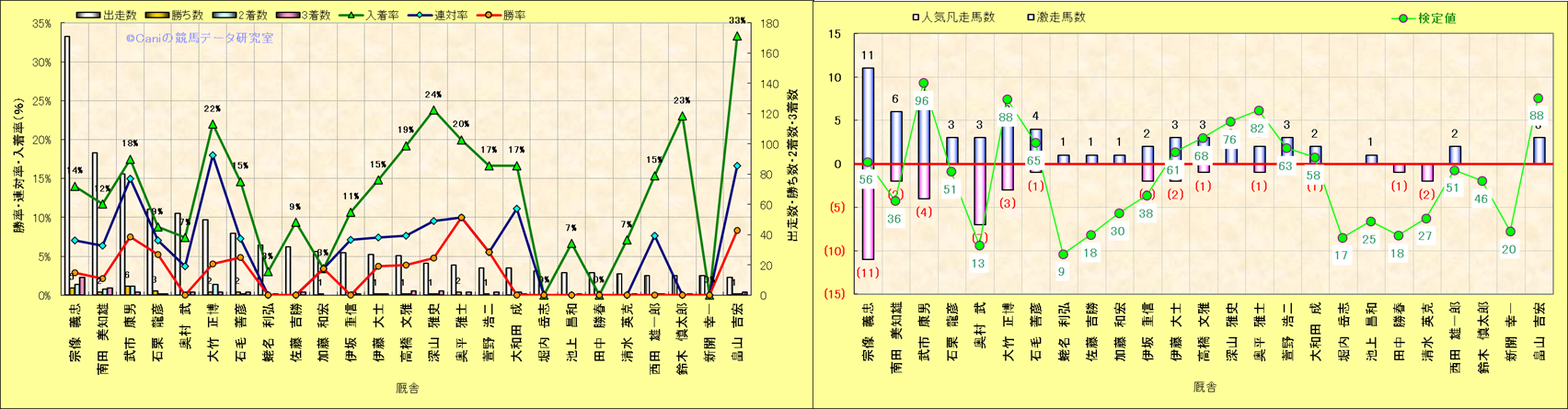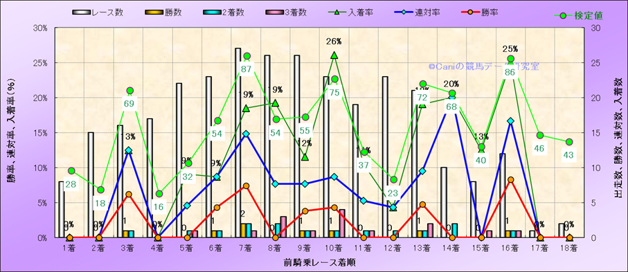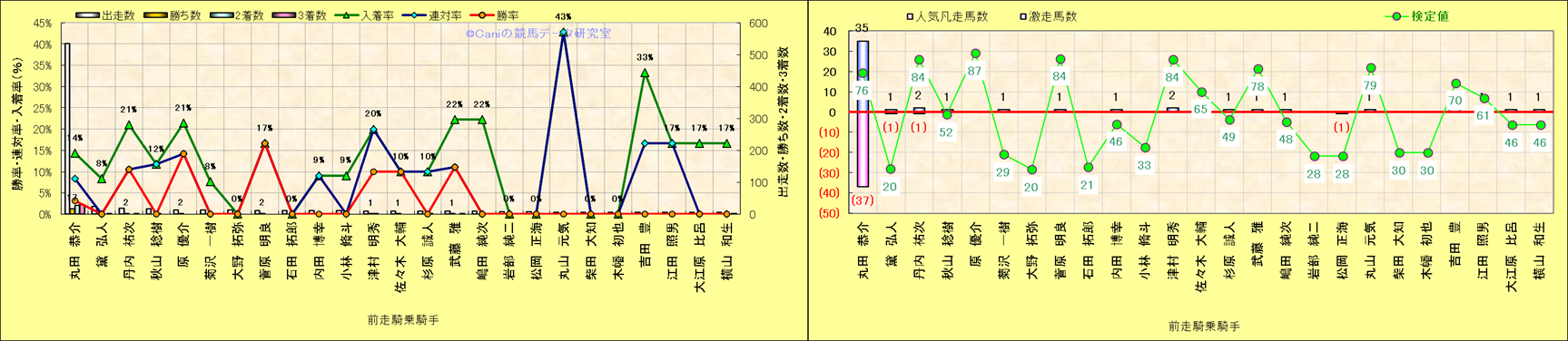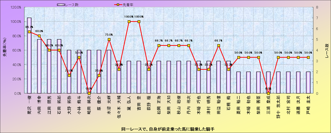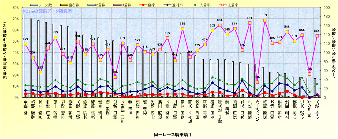 ライバル(相性)解析。 同一レースに下記騎手が騎乗した場合の成績と、その騎手に先着する先着率(近1年) |