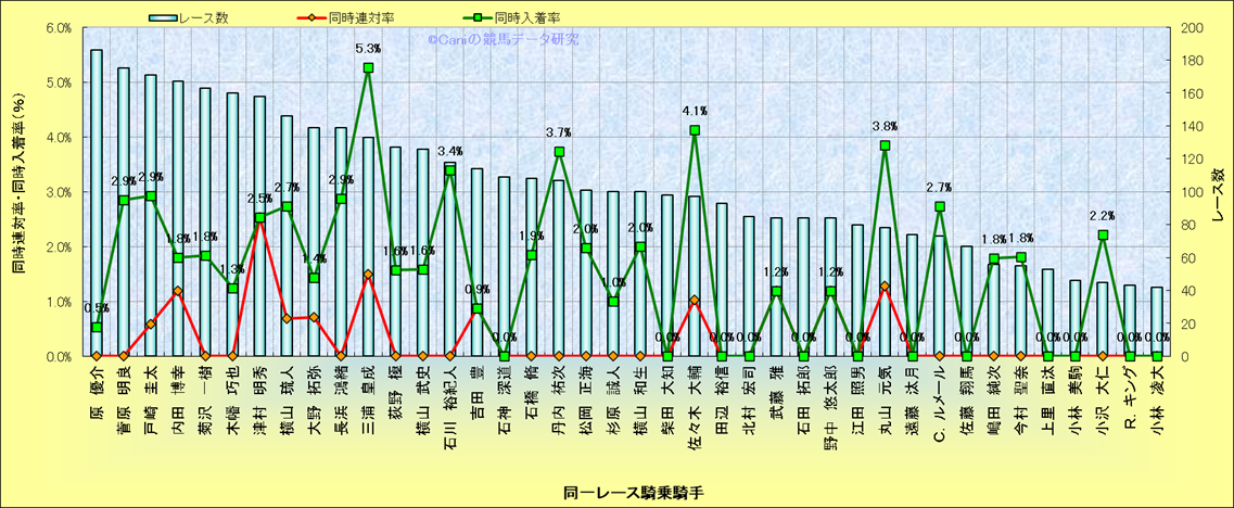 ライバル(相性)解析。 同一レースに下記騎手が騎乗した場合の同時に連対する率と同時に入着する率(近1年) |