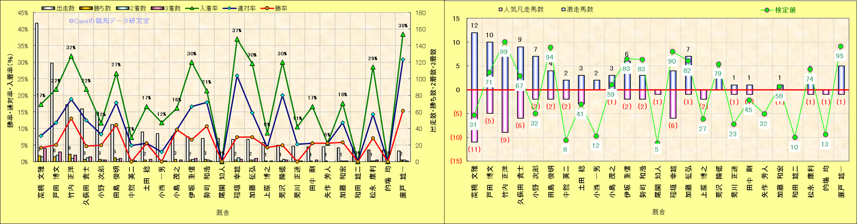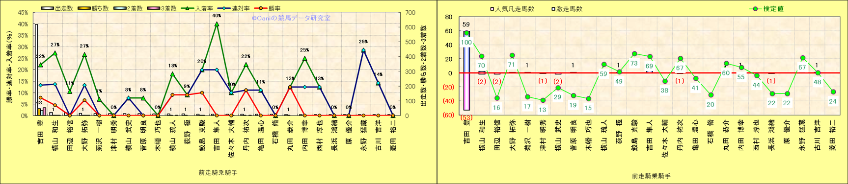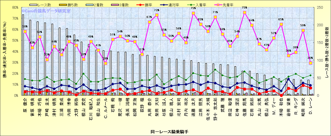 ライバル(相性)解析。 同一レースに下記騎手が騎乗した場合の成績と、その騎手に先着する先着率(近1年) |