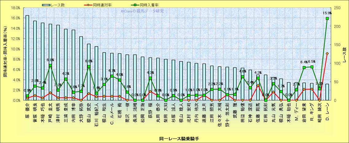 ライバル(相性)解析。 同一レースに下記騎手が騎乗した場合の同時に連対する率と同時に入着する率(近1年) |