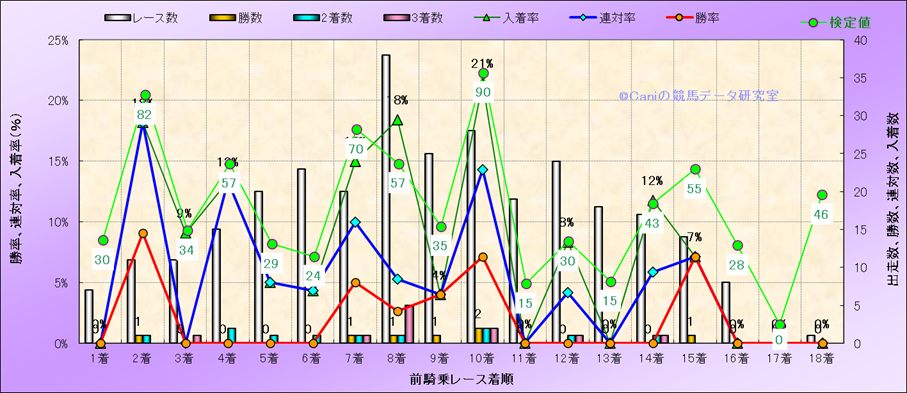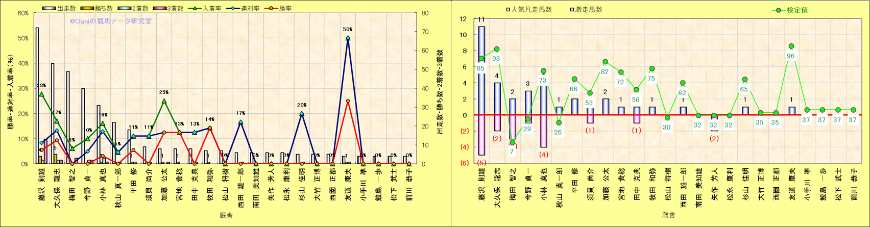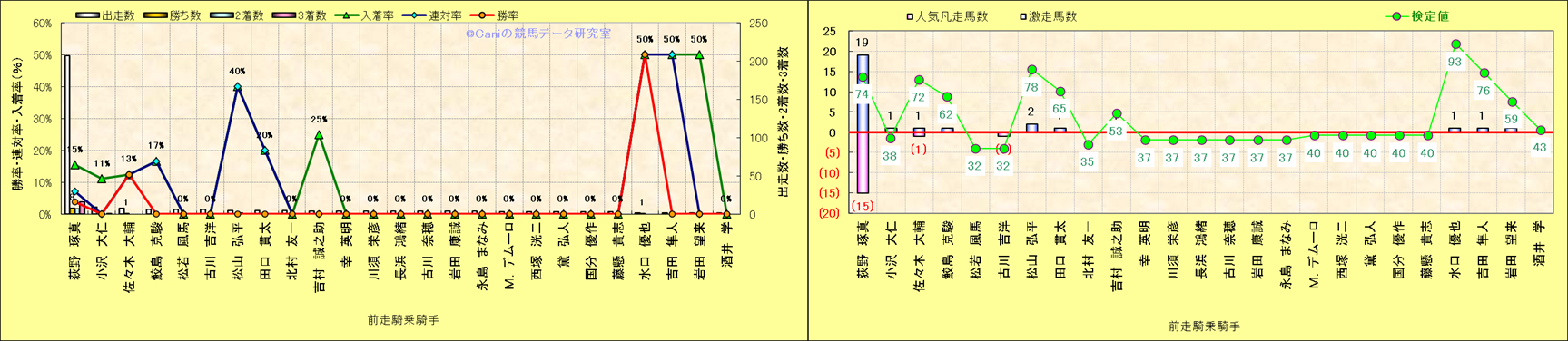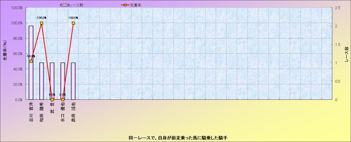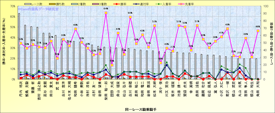 ライバル(相性)解析。 同一レースに下記騎手が騎乗した場合の成績と、その騎手に先着する先着率(近1年) |