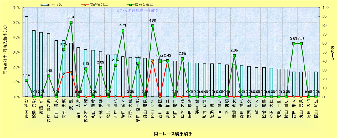 ライバル(相性)解析。 同一レースに下記騎手が騎乗した場合の同時に連対する率と同時に入着する率(近1年) |