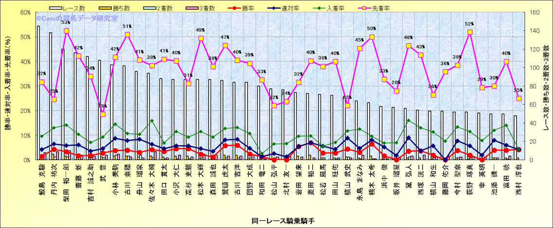 ライバル(相性)解析。 同一レースに下記騎手が騎乗した場合の成績と、その騎手に先着する先着率(近1年) |