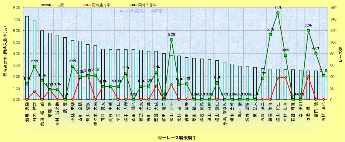 ライバル(相性)解析。 同一レースに下記騎手が騎乗した場合の同時に連対する率と同時に入着する率(近1年) |