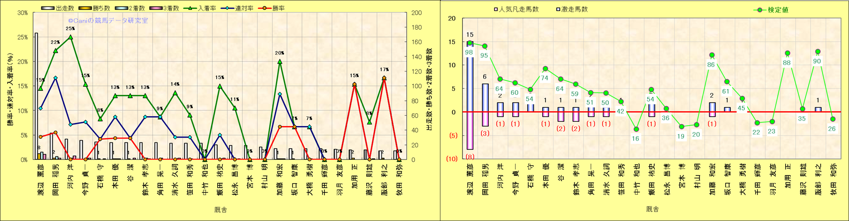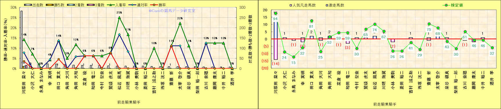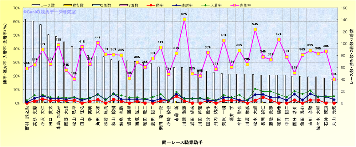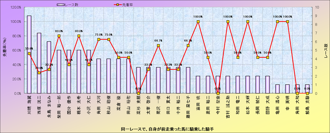 ライバル(相性)解析。 同一レースに下記騎手が騎乗した場合の成績と、その騎手に先着する先着率(近1年) |