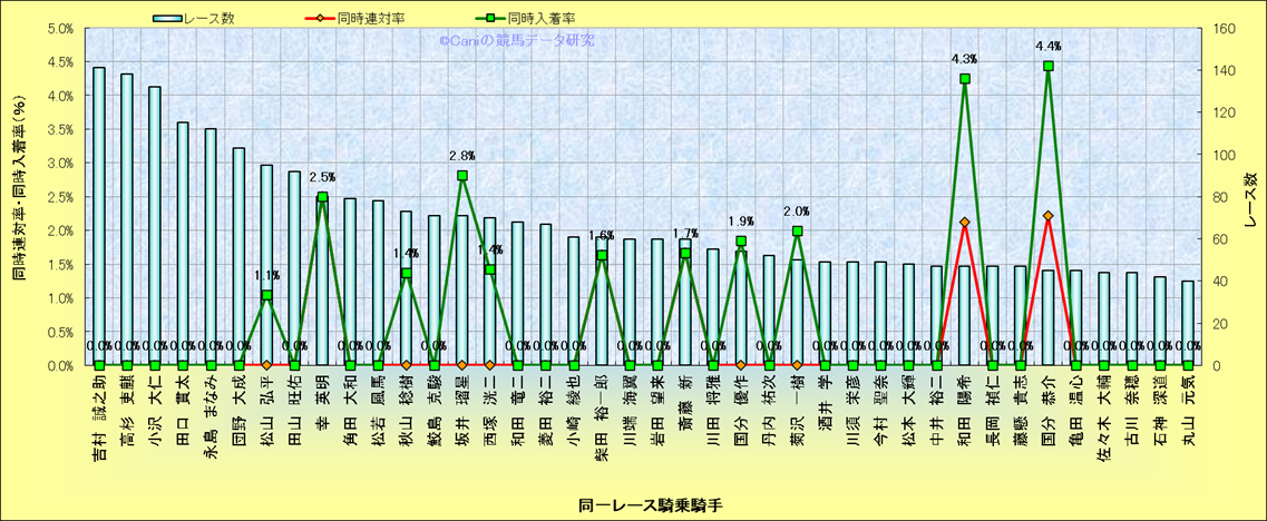 ライバル(相性)解析。 同一レースに下記騎手が騎乗した場合の同時に連対する率と同時に入着する率(近1年) |